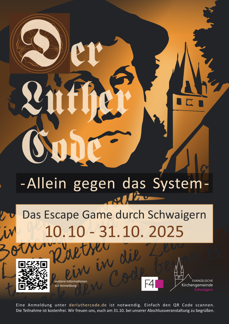 Was ist Der Luther-Code – Die Outdoor Escapetour durch Schwaigern? Stell dir eine Mischung aus Escape Room und Stadtrallye vor – mitten in Schwaigern. Nach einer kurzen Einsweisung durch einen unserer Mitarbeiter löst ihr gemeinsam im Team knifflige Rätsel, entdeckt verborgene Hinweise und entschlüsselt geheime Botschaften. Per Smartphone-App werdet ihr von Station zu Station geführt, taucht immer tiefer in die Geschichte Martin Luthers ein – und kommt dem großen Geheimnis Stück für Stück näher. Euer Ziel: Den Code knacken, bevor die Zeit abläuft! Nähere Informationen folgen bald.